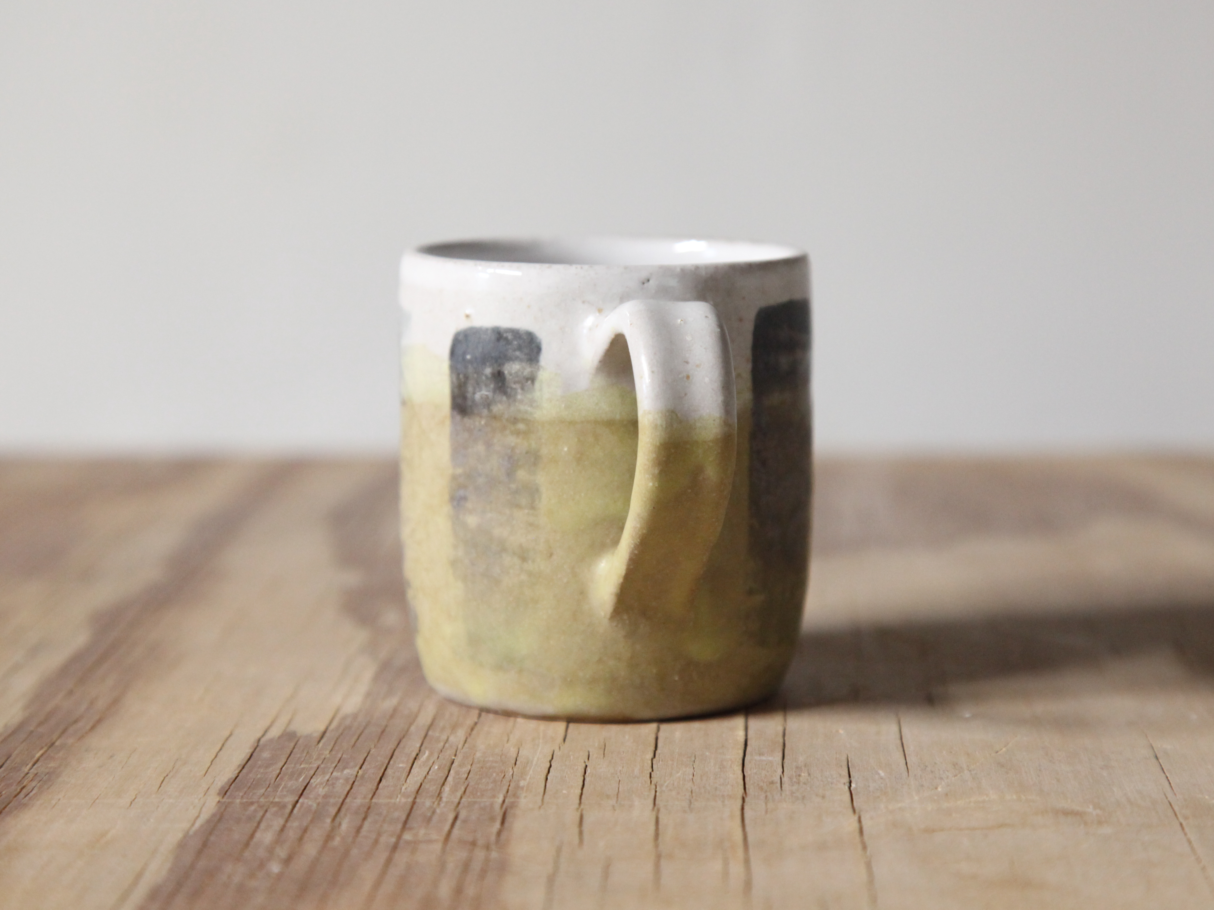 details: stoneware with white, charcoal grey and dipped yellow glaze